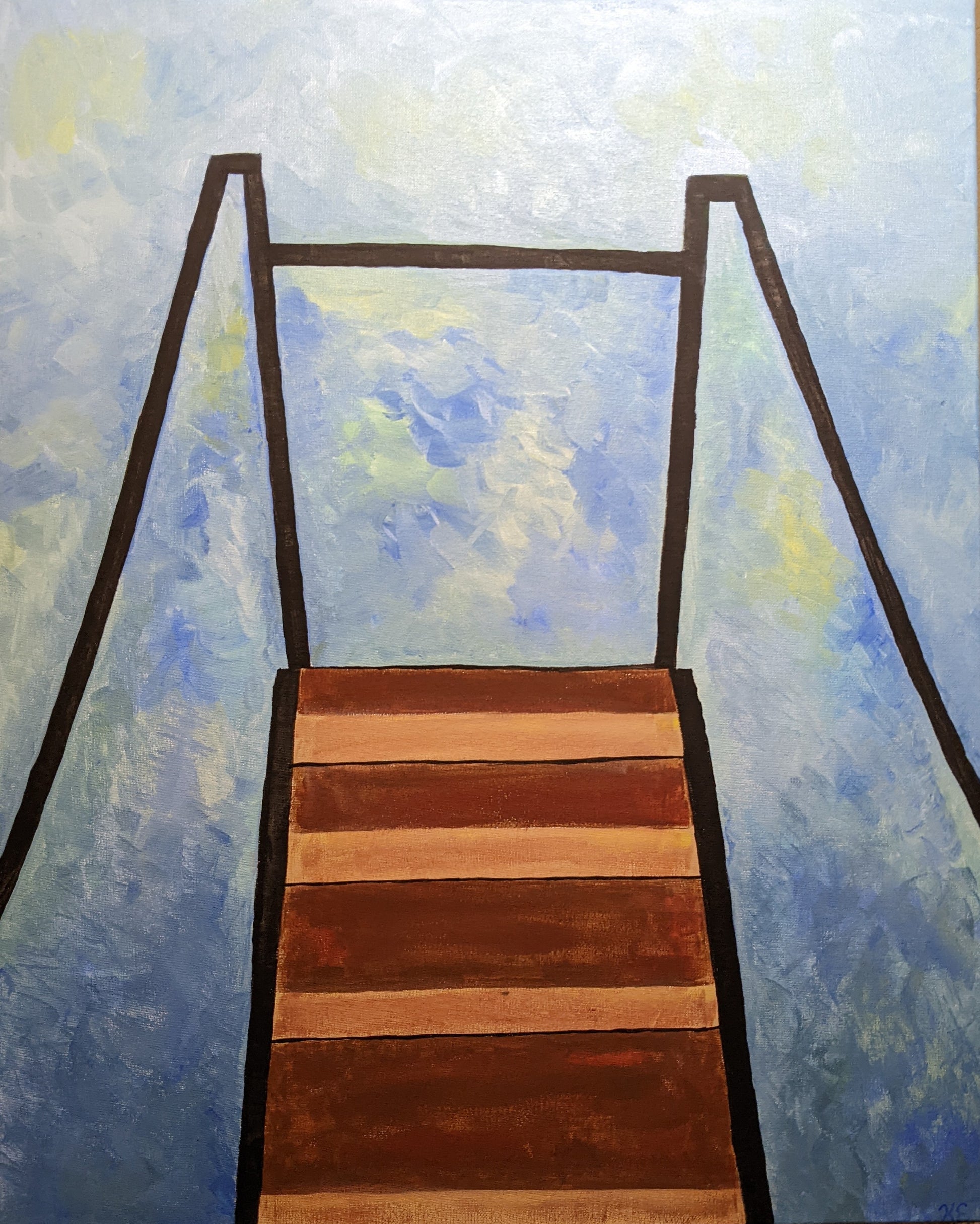Dreamscape is a piece featuring blue, yellow, and brown. It shows a stairway to your brightest dreams. The dimensions are 24 inches by 30 inches.