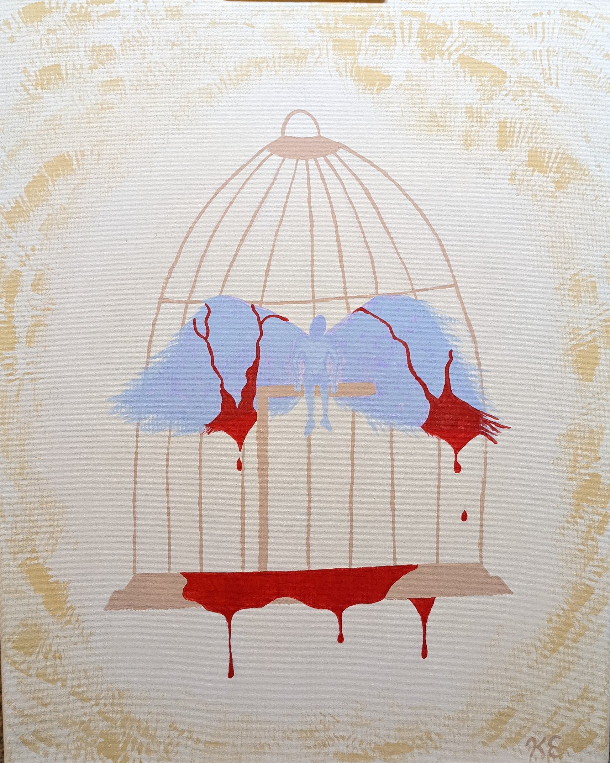 This piece features the colors grey, red, and gold. A grey figure with no face rests bloodied on a golden perch. This treasure is held captive in a cage by its oppressor. Its dimensions are 16 inches by 20 inches.