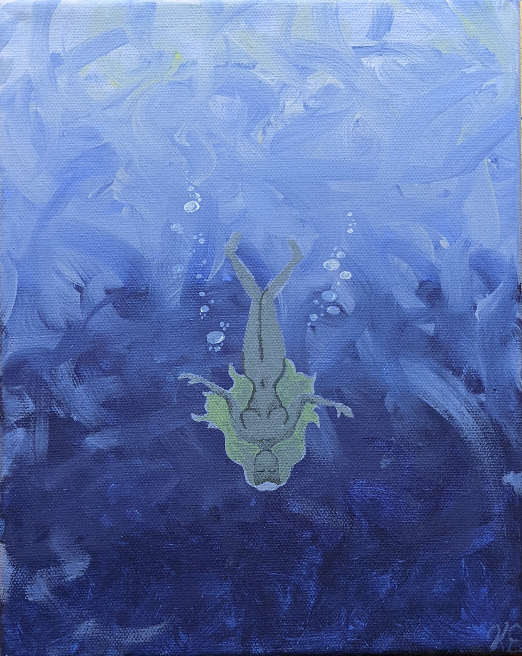 Watery Dreams features shades of blue and grey. A grey woman is upside down amongst the waves of blue. Its dimensions are 8 inches by 10 inches.